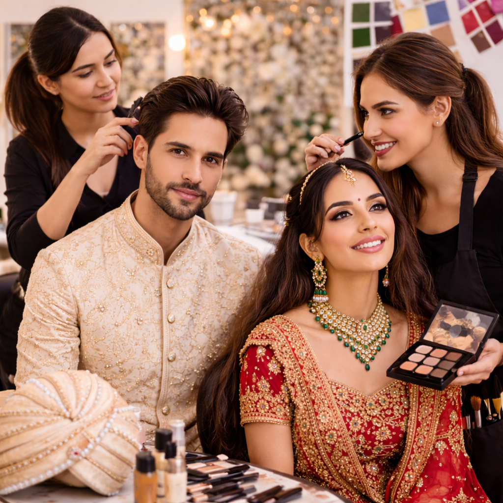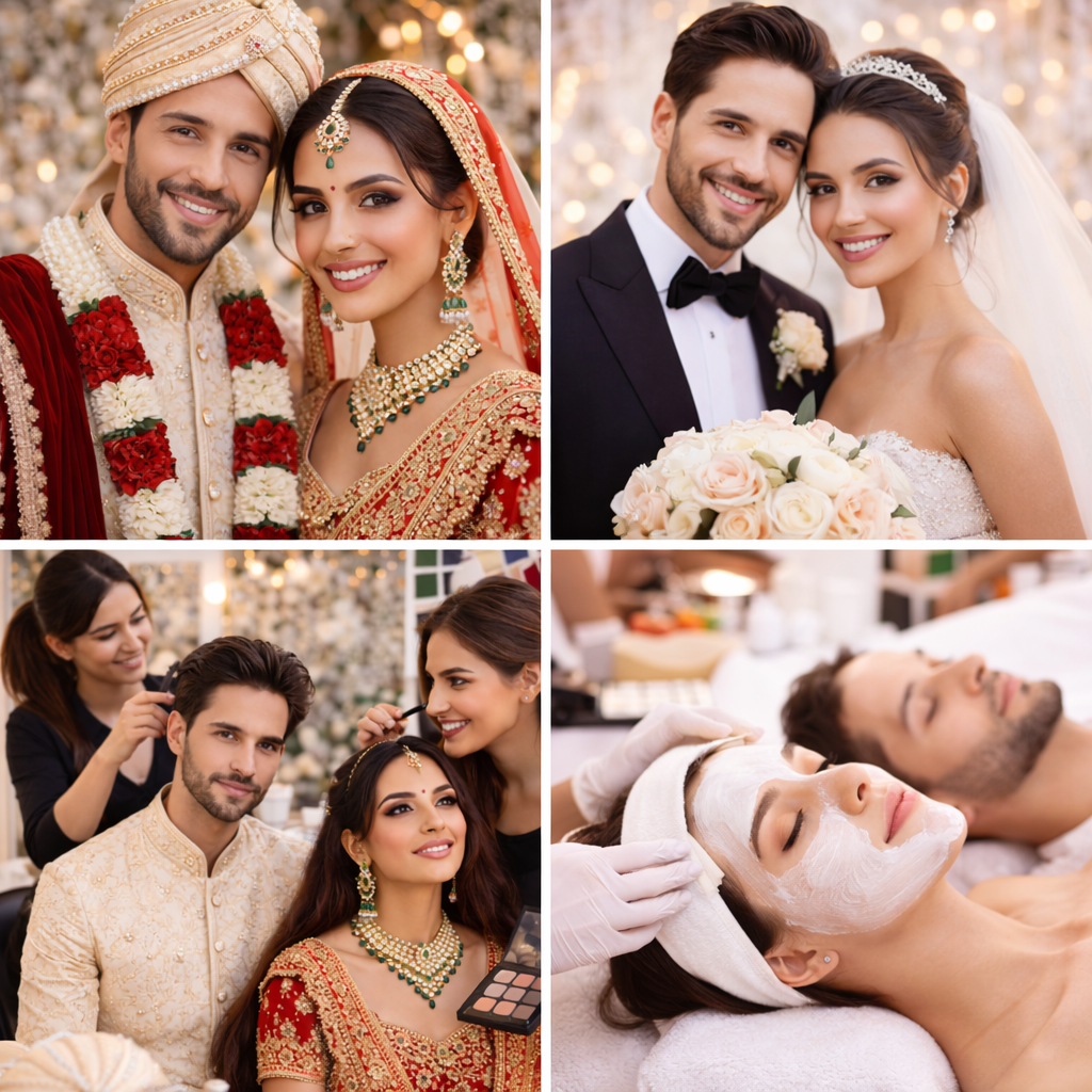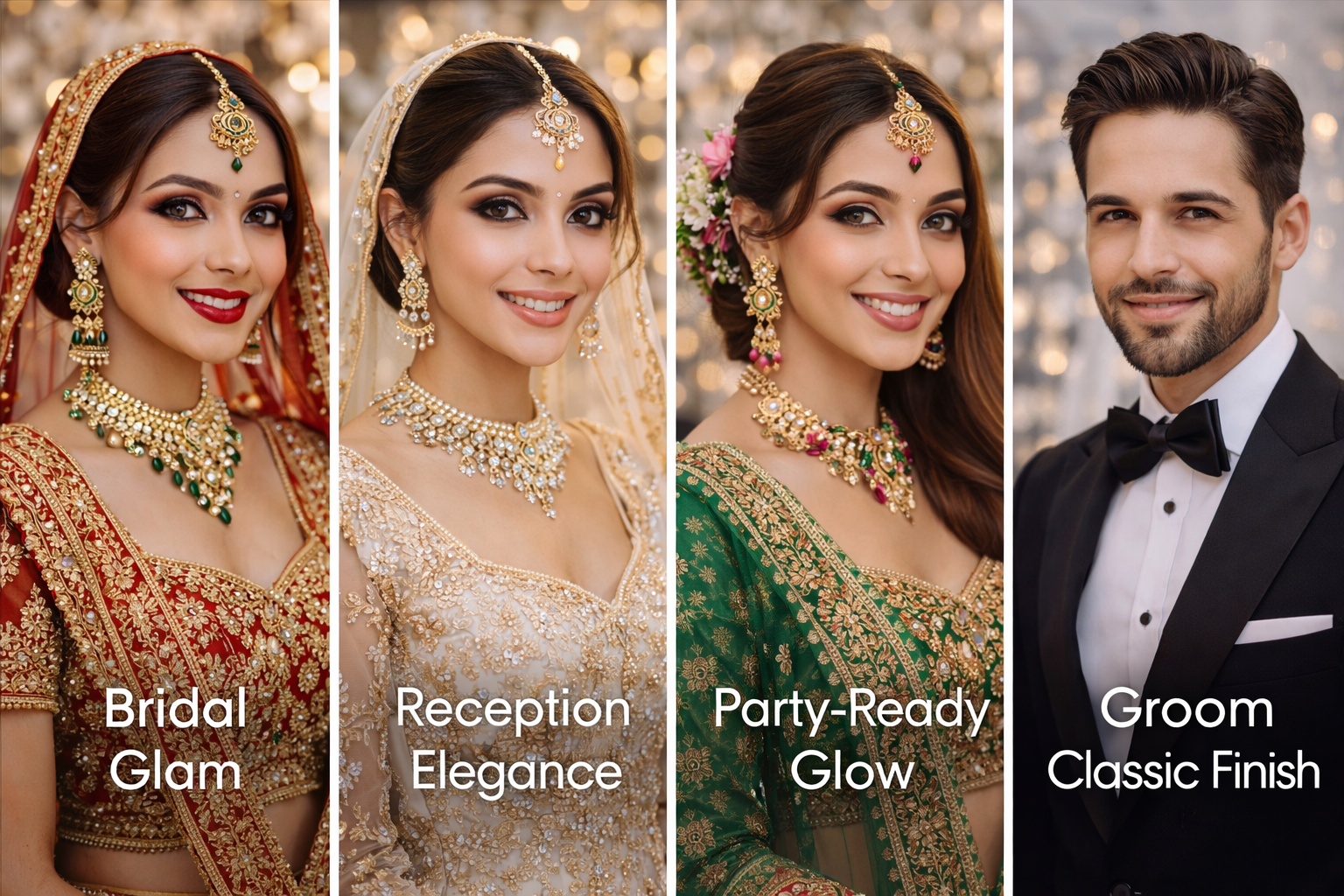 Bridal Glam, Reception Elegance, Party-Ready Glow, and Groom Classic Finish—crafted to suit every face shape, outfit, and celebration.